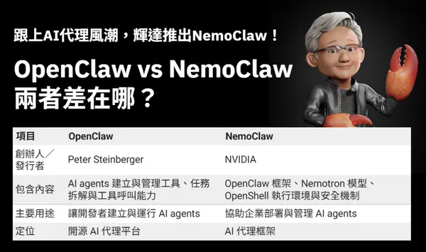輝達推出NemoClaw攻AI代理市場:它跟OpenClaw差在哪?黃仁勳為何說每家公司都要有?