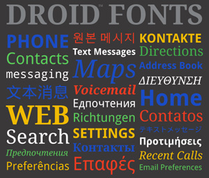 在Android平台中,只有內建一種字體,名為Droid,這是由Google和數位字型公司Ascender的共同合作成果。一般人可能無法理解字體居然需要設計,也無法想像這項工程的耗時耗力,事實上,這項字體設計專案耗費近兩年的時間才完成,幾乎等同於讓Android平台從無到有的工程。