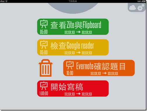 點擊左上方的按鈕兩下,可以進入「清單選擇」畫面,也就是說你可以預設好適合不同工作的時間排程。