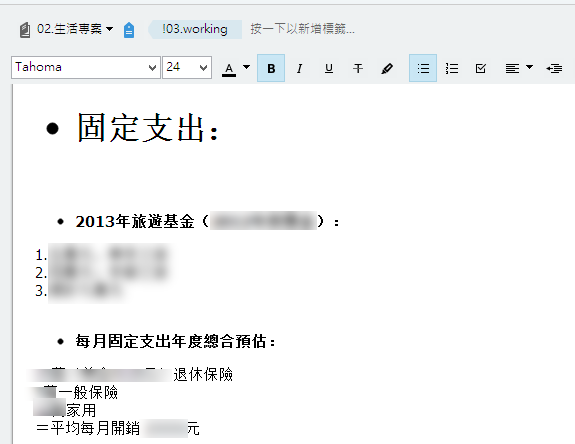 有多簡單?我就在同一則筆記下方,計算我自己每個月的固定支出預算,包含保險費、家用費等等,從薪水中先扣除,然後就知道我有多少錢是可以動用的。
