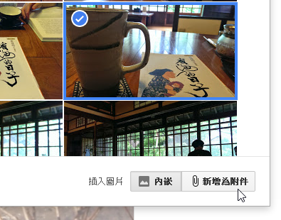 我依然可以在 Gmail 寄信時,選擇把 Google 相簿裡想要分享的某幾張照片,以傳統的郵件附檔插入照片方法來寄送,對方可以在郵件附檔中看到我插入的照片。