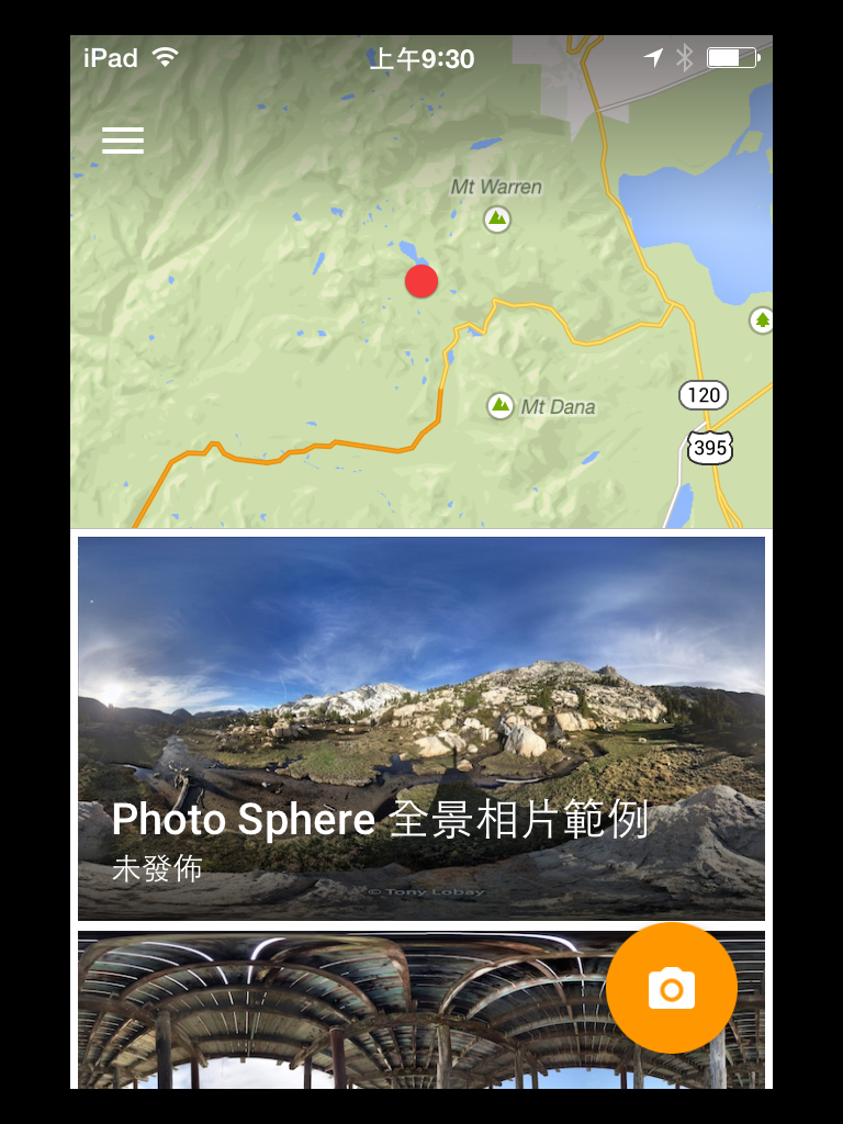 5.在「Photo Sphere Camera」主畫面中,則可以看到你已經拍攝的全景照片清單,包含他們的定位地圖,你也可以登入自己的Google帳號,便能上傳街景。
