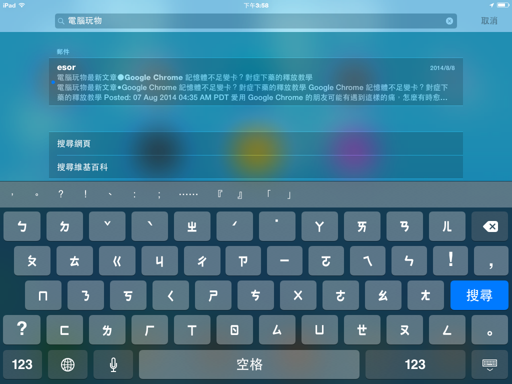大家最近把自己的iPhone 或 iPad 更新到 iOS 8 了嗎?更新後的這幾天,對我來說最有感的就是「輸入法」的改進。使用 iPad 一直以來我覺得最困擾我的就是輸入法的問題,之前 iOS 內建的中文注音輸入不僅反應慢,而且要完整輸入注音,也沒有很聰明的選字,在整體輸入上缺乏效率。