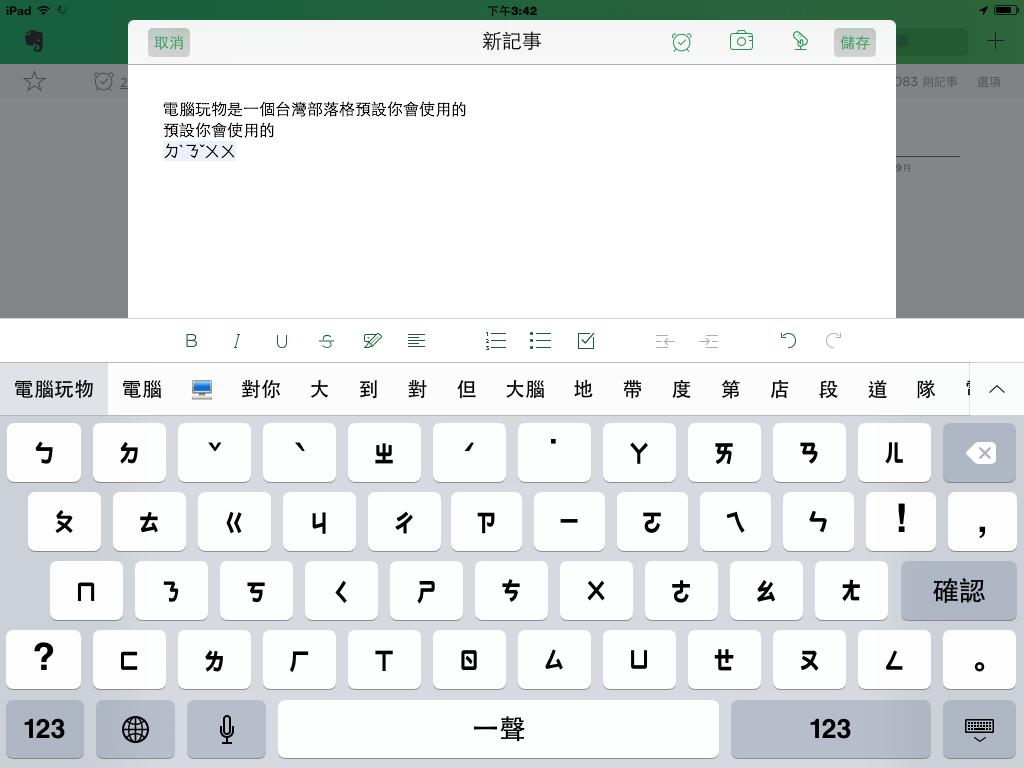 不過今天我要推薦的不是第三方輸入法,而是在 iOS 8 更新後, Apple 自己內建的台灣中文注音輸入法也有了大幅改進,追上了在 Android 上用戶已經習以為常的「必備高效率輸入規格」,例如注音符號首字快速輸入。