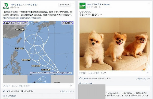 左邊的貼文是目前的颱風速報,發佈可以提供旁人參考的情報,可以煽動引發分享。這個便是上述所說的具有「當前」意義的事物。