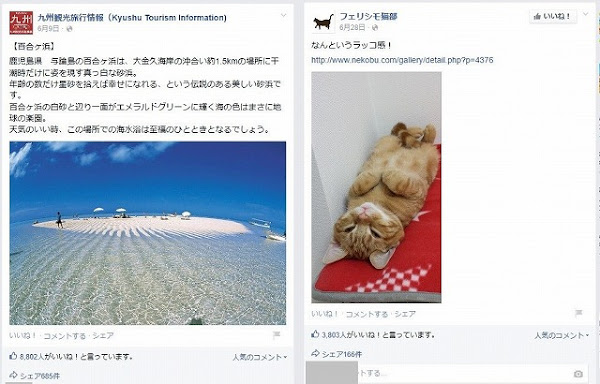 在臉書中屹立不搖穩坐王位的話題,依舊是美景或動物的照片。根據臉書專頁的主旨,這種貼文雖然無法被推廣,事實上卻容易被分享出去。