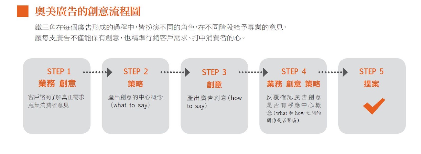 龔大中說明,奧美的廣告產出有一套基本的工作模式:由業務(account)、策略(planner)跟創意(creative)部門,分別負責了解客戶的習慣跟偏好、市場洞察,以及為創意的好壞把關,形成一個重要的鐵三角架構。