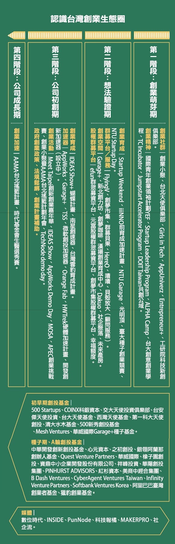 要建造一個完整的創業生態圈,政策和資金到位還不夠,還得包括人才培育、創業育成、創業導師人脈及經驗傳承。若將台灣創業生態圈依照創業萌芽期、想法驗證期、公司初創期、公司成長期這四個階段分類,會發現目前的資源都擠在第三個階段,也就是大部分的創業活動、計畫、補助以及政策都是為新創公司而服務。