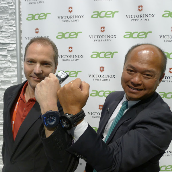 圖說:宏碁智慧型手機事業群總經理劉思泰(右)、Victorinox執行長Alexander M. Bennouna(左)在MWC展示合作的智慧錶框。(圖片來源:詹子嫻攝)