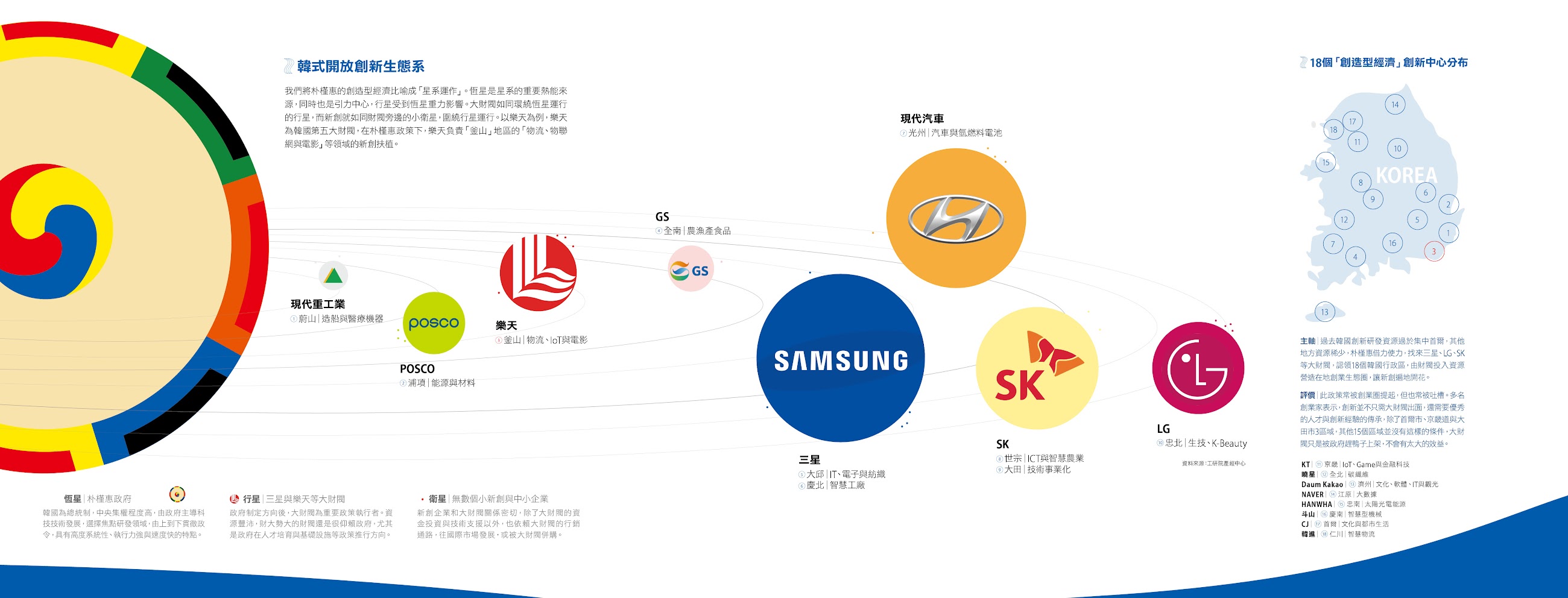 過去韓國創新研發資源過於集中首爾,其他地方資源稀少,朴槿惠借力使力,找來三星、LG、SK等大財閥,認領18個韓國行政區,由財閥投入資源營造在地創業生態圈,讓新創遍地開花。