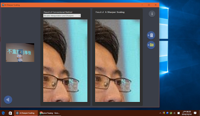 進行照片放大後,「 Sharper Scaling 」會顯示出一個比較圖,左方是一般軟體放大後的效果,右方是「 Sharper Scaling 」放大後的效果,如果你覺得滿意,按下最右邊的儲存,就能另外儲存成更大解析度的圖片(因為照片放大了)。