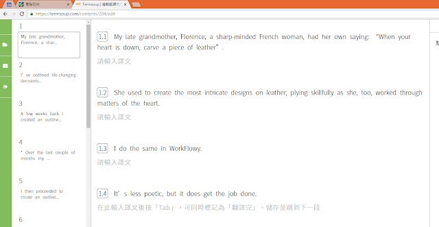 整個「 Termsoup 」的譯稿編輯畫面中,左方是切開來的翻譯進度段落,中間是原文與譯文對照的編輯畫面,而右方就是各種資料與翻譯的「自動查詢」清單。
