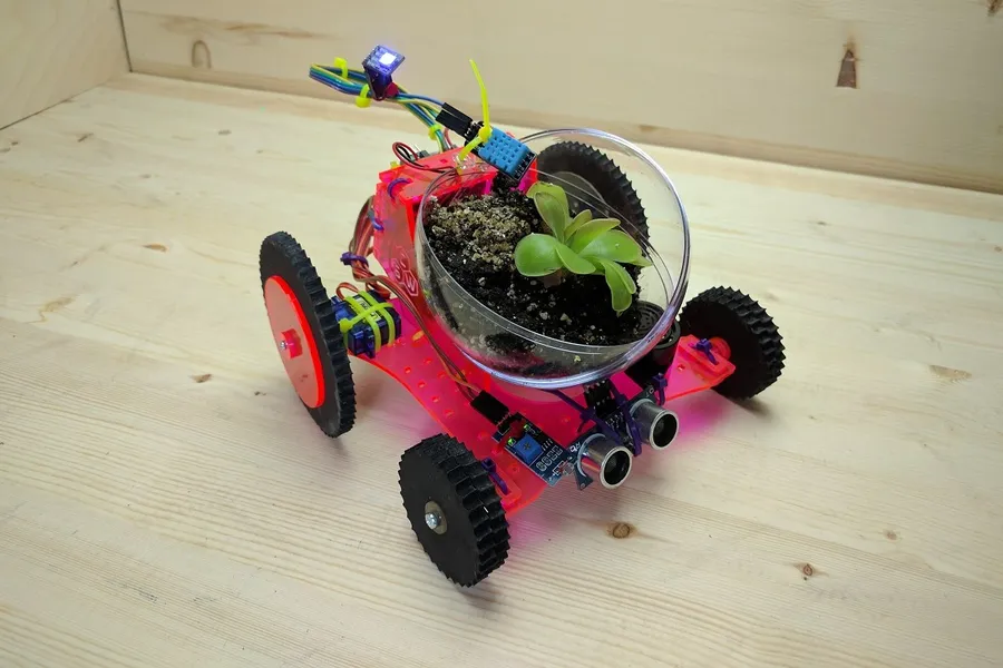 Plantoid Robotic 正如其詞就是「仿植物的機器人」(編:Plantoid 如 Android/仿生人 一樣,由希臘語詞根 -oid/形似之義組合而來,為這幾年新增加的單字),但並非對植物進行機械改造,而是在植物盆栽中加裝各種感測器,並加上輪胎賦予移動能力,讓植物能夠自行前往尋找適合生長的環境。雖然還是沒有辦法跟人類溝通,但能夠自己去「覓食」也算是更直接地解決了人類不懂需求的困擾,目前加裝的感測器能夠偵測土壤濕潤度、空氣溫度及濕度、環境光照及空氣品質,幾乎包含了所有植物生長因素(但還是需要人類澆水,除非植物能單靠濃郁水氣生存)。
