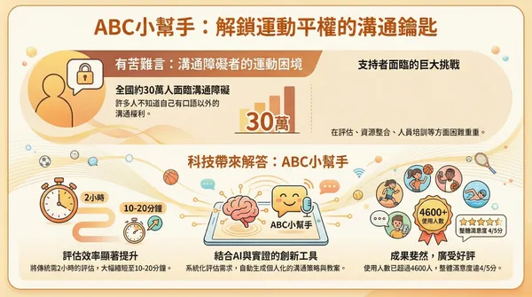 科技的創新價值,在於為每一個渴望運動的靈魂,移除環境中的無形高牆。由 國立臺灣師範大學開發的「正向行為溝通小幫手ABC」,其核心宗旨即在於透過溝通支持,具體落實運動平權。許多身心障礙者並非不願參與運動,而是因為缺乏合適的溝通輔具,導致無法理解規則或表達意願,進而被體育活動拒於門外。本系統跳脫傳統單純處理行為問題的視角,而是致力於搭建溝通橋樑,從源頭減少因溝通受挫而產生的行為阻礙。我們運用數位科技協助體育教師、教練與家長,快速評估個案在運動情境中的溝通需求。系統能結構化地引導使用者,媒合出適合的視覺化溝通策略,讓溝通障礙者也能理解指令、適度表達及融入團隊。此創新模式將原本高門檻的溝通評量與策略擬定變得普及易用,目前已在實務場域進行驗證與推廣,象徵著「以科技打破溝通藩籬,讓每個人都能享受運動樂趣」的新典範。