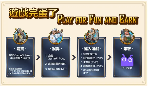 「遊戲完蛋了」GameFi版融合了代幣經濟,玩家需要使用遊戲專屬代幣「BUG」,來恢復角色生命,以及購買虛擬道具。此外,玩家在可以把獲得的NFT拿來質押(類似將錢存在銀行定存,獲得利息的一種方式)到去中心化交易所(指沒有第三方涉入交易的平台)兌換成其他加密貨幣。