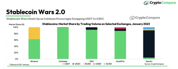 報告中還追蹤了「穩定幣之戰 2.0」的後續情況,起於美國上市加密貨幣交易所 Coinbase 於去年 12 月初出免手續費優惠,呼籲用戶將手中的 USDT 換成 USDC。只可惜成效似乎不如預期,當前 Coinbase 裡涉及 USDC 所締造的交易量還不到 1%。