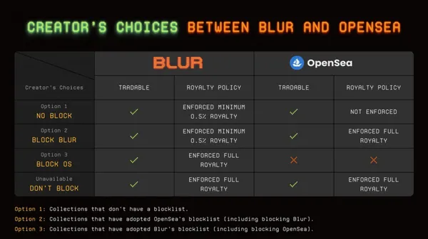 Blur認為,創作者在所有列入白名單的市場上都應能賺取版稅,因此建議創作者「不要」使用OpenSea。為了鼓勵這一點,任何不使用OpenSea的收藏品,在Blur平台上都會被強制執行全額版稅。