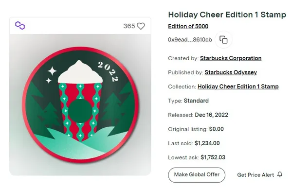 也由於聖誕假期歡慶版郵票,意義上算星巴克第一套NFT,加上每年的聖誕假期主題都不一樣,2022年底的數位體驗特別任務已經結束,限時限量特別有價值,貢獻了目前星巴克NFT八成的交易量(170,636美元),最高售價達2千美元。