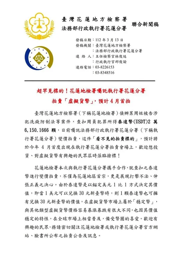 昨天(13 日)台灣花蓮出現罕見的加密貨幣法拍案,拍賣標的竟是泰達幣($USDT),預計在 4 月首度出現在花蓮分署得拍賣會上,還廣邀投資者前來參與競標。