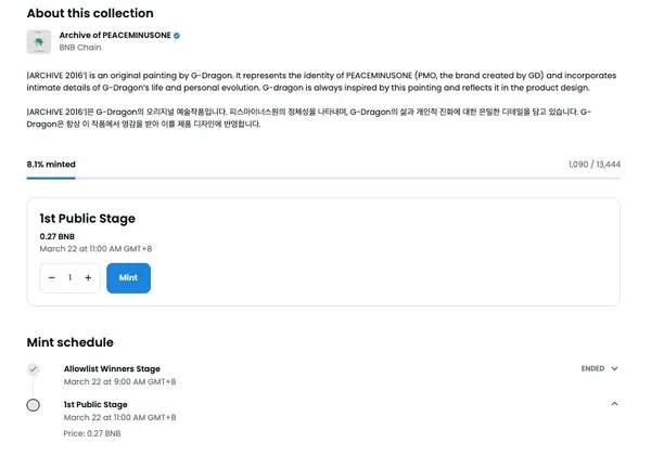 • 首波:今日(3/22)早上 9 點開放白名單搶先鑄造(Mint)、11 點開放公售,共 13,444 張,鑄造價格(Mint Price)為 88 美元(0.27 $BNB)。