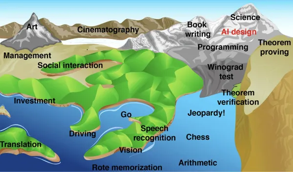 景觀圖中,呈現海拔高低不等且多樣態的地貌,從地勢低的谷地、海洋,到地勢高的山峰。若把AI比喻為洪水,首當其衝的是已被淹沒在海水之下的死記硬背、象棋、算數、益智問答等,該區域已被AI完全替代;在海面與陸地連接的翻譯、駕駛、語音辨識、投資等係即將被AI取代的危險區;而在山峰上的科學、作家、藝術、人AI設計等,短期內離遭滅頂有段距離,相對而言安全。