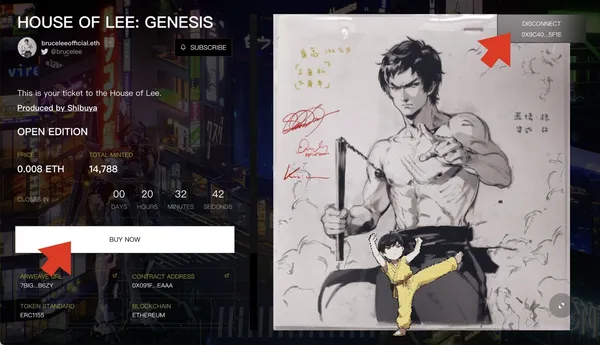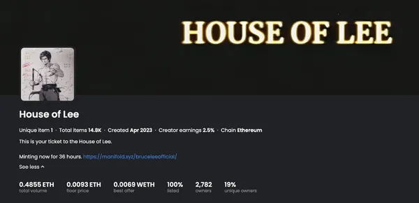 該系列名為《HOUSE OF LEE: GENESIS》,由 NFT 影音平台「Shibuya」和李小龍基金會合作推出,採取限時 36 小時,總量無上限的販售模式(Open edition),鑄造價格為 0.008 枚以太幣($ETH)一張,以現價計算大約 15 美元。