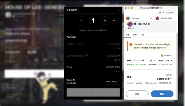跳出彈窗後,選擇自己要的數量,按下購買並在錢包彈窗中確認,即可完成鑄造。