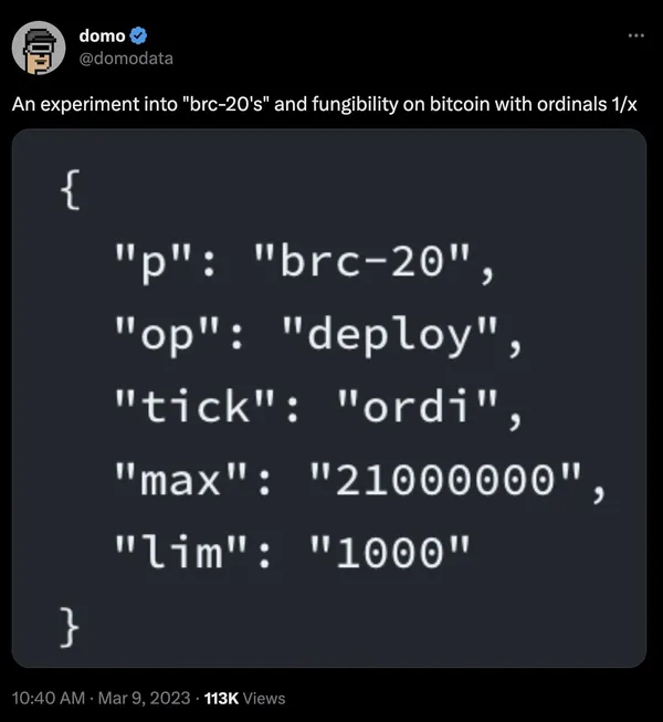 不過,一名暱稱domodata的區塊鏈分析師,近期針對Ordinals協議進行了一場實驗,讓比特幣區塊鏈也能「發幣」。