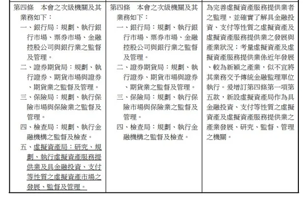 - 草案重點三: 考量到虛擬資產業較新穎,而且仍在持續發展,因此不適合把監管交給傳統的金融監管單位,應新設第五局「虛擬資產局」專門研究、監督與管理。