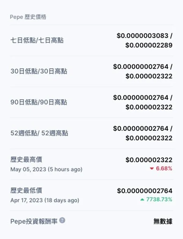 雖然 $PEPE 漲幅驚人,也曾傳出讓人大賺數千倍的「暴富神話」,但也不能忽視背後的投資風險。事實上,$PEPE 的每日漲跌幅都非常劇烈,譬如在 5 月 2 日曾從 0.00000143250 跌至最低 0.00000100665,跌幅約 30%;而昨日又出現單日超過 80% 的漲幅。