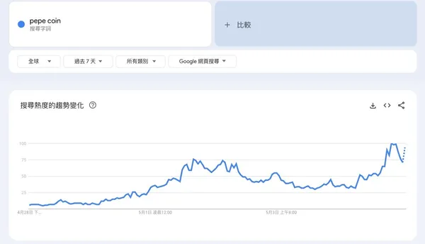 不過,從5日凌晨 3 點開始,「Pepe Coin」的 Google 搜尋分數,從 51 分快速成長至 100 分,可能是跟 $PEPE 又再度飆漲有關。根據 CoinMarketCap 的數據,今早 $PEPE 一度漲至 0.000002322 美元,創下歷史新高。