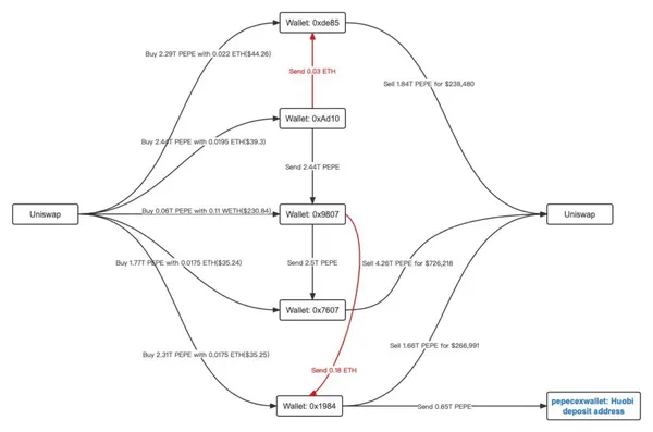 區塊鏈數據分析公司 Lookonchain 也發現,據稱跟 $PEPE 團隊有關的 5 個地址,以低價購買了 8.87 兆枚 $PEPE,並在漲到高點時,於去中心化交易所 Uniswap 上出售了 90% 以上,利潤高達 123 萬美元。