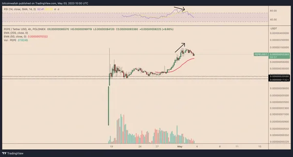 分析師 Gola 還曾發現,在 5 月 3 日當天,$PEPE 的 4 小時價格走勢與相對強弱指數(RSI)產生背離。在技術分析中,若價格持續上漲,RSI 指數卻是向下趨勢,就暗示未來下跌的機率會上升。他指出,若 $PEPE 未來跌破圖中紅色指數移動平均線(50-4H)的話,可能會進一步測試 0.00000020-0.00000017 美元支撐。
