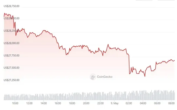 截稿前比特幣區塊鏈有 45 萬筆交易正在排隊序列中,當前比特幣價格報 27,666 美元,過去 24 小時下跌 3.1%,過去 7 天比特幣價格下跌了 1.6%。