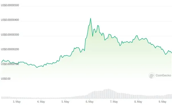 近期紅遍幣圈社群的迷因幣 PEPE 幣,在正式上架幣安交易所後價格開始下跌,截稿前迷因 PEPE 幣價格報 0.00000184 美元,過去 24 小時下跌 32.2%,過去 7 天迷因 PEPE 幣價格上漲了 53.4%。