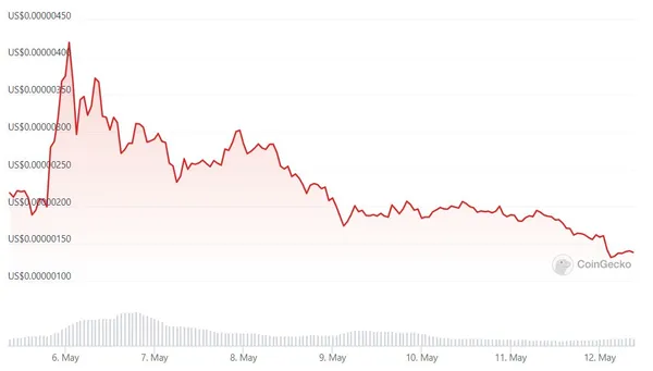 隨即 Coinbase 下架了該 PEPE 幣的介紹短文,而首席法務官也正式道歉,表示他們並沒有完整地向投資者們介紹 PEPE 幣的歷史全貌。然而,PEPE 幣價格似乎沒有因受到社群關注而上漲。當前 PEPE 幣價格報 0.00000138 美元,過去 24 小時下跌 26.2%,過去 7 天 PEPE 幣價格則下跌了 29.0%。
