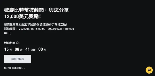 - 報名活動方式:進入幣安官方報名頁面,點擊「立即報名」按鈕,並登入幣安帳號。若你是使用幣安 APP,則可在首頁點擊「更多」>「公告中心」>「最新活動」,並找到「歡慶比特幣披薩節」的活動後,點擊活動頁中的黃色提示按鈕即可報名。報名成功後,原本的黃色按鈕會顯示「帳戶已報名」。