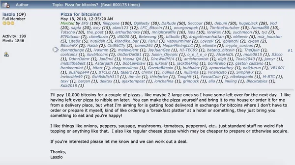 在 2010 年 5 月 22 日,一位叫 Laszlo Hanyecz 的工程師花了一萬顆比特幣購買兩片 Pizza,這筆交易普遍被認為是比特幣在現實世界中的第一筆交易。