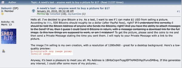 從 Udi Wertheimer 提供的截圖,我們找到了發佈在 Bitcointalk 的這則貼文,從時間上來看,這則貼文的發文日期為 2010 年 1 月 24 日,相較同年披薩日的 5 月 22 日要早了 4 個月以上。