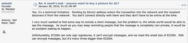 在貼文下方,還出現了化名中本聰(Satoshi)的用戶,嘗試為 Sabunir 解決附加訊息的難題,他提到:「ECDSA 只能簽署簽名,不能加密消息,我們需要 ECDSA 的小尺寸。RSA 可以加密消息,但它比 ECDSA 大很多倍。我很想找到一些方法來包含一條短消息,但問題是,全世界都可以看到這條消息。」