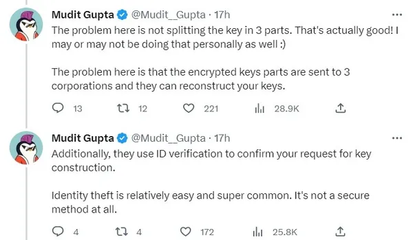 然而 Polygon 安全長 Mudit Gupta 認為,將助記詞主動送到保管人手上本身已經具有風險了,Ledger 所採用的「身份認證」恢復制度更是相當危險的,因為偽造身份遠比駭取資訊容易的多。