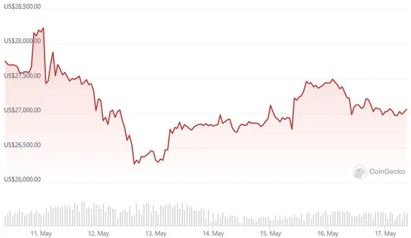 另一則報導則指出,雖然美國歷史上早已多次在最後關頭解決債務危機,但如今仍是不少投資人的心頭隱患,降低風險資產的交易意願。截稿前比特幣價格報 27,053 美元,過去 24 小時下跌 0.6%,過去 7 天比特幣價格下跌 2.3%。