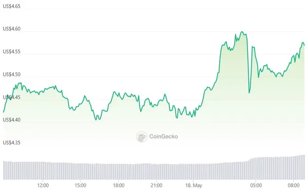 截稿前 FlL幣價格報 4.59 美元,過去 24 小時上漲 3.3%,過去 7 天 FlL幣價格下跌 0.9%。