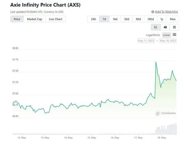 根據幣虎(CoinGecko)數據,AXS在5月17日達到9.6%漲幅,價格約為7.44美元(約新台幣229元),而SLP代幣也獲得了4.2%的漲幅。