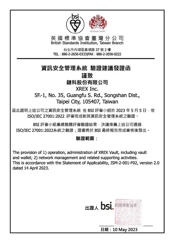 由區塊鏈金融機構 XREX 經營的 XREX 交易所,再次獲得資安能力的國際肯定,成為台灣第一家通過英國標準協會 (The British Standards Institution, BSI) 稽核,取得國際標準組織 (International Organization for Standardization, ISO)「 新版 ISO/IEC 27001:2022 國際資訊安全管理制度」認證的公司,並已在 XREX 內部正式實施此制度。