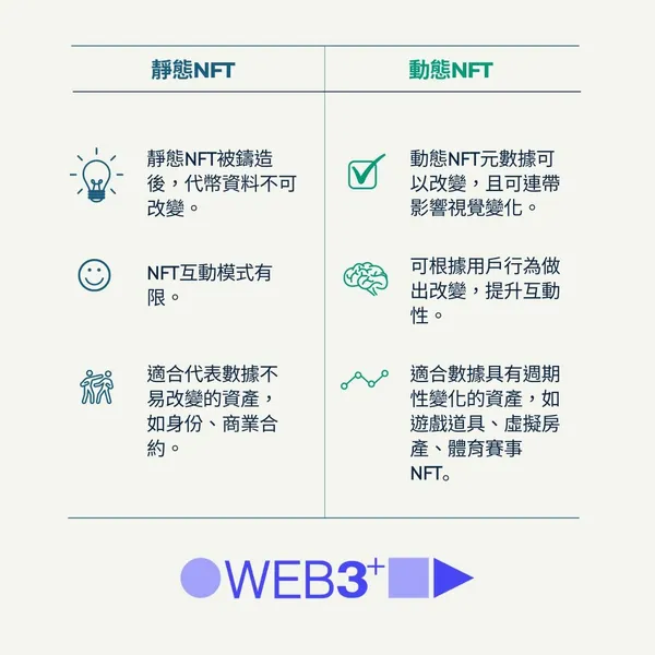 需注意的是,不是「會動」就代表一定是動態NFT,以影片或GIF檔呈現的普通NFT,在鑄造後仍是無法修改的;反之,動態NFT在鑄造後,依然能透過修改元數據(Metadata)來改變外觀。