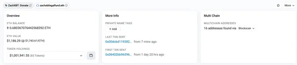 ZachXBT的錢包地址迅速湧入了捐款,目前已經超過一百萬美元(約三千萬新台幣),而款項仍在不斷增加。