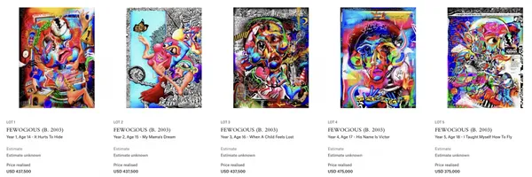 由於作品風格獨特,受到NFT社群高度讚揚,其中五件作品在2021年佳士得拍賣會上售出,總價高達216萬美元(約為6千4百萬台幣),憑藉著才華和勇氣,年紀輕輕就在虛擬藝術世界,創造了自己的一片天地。