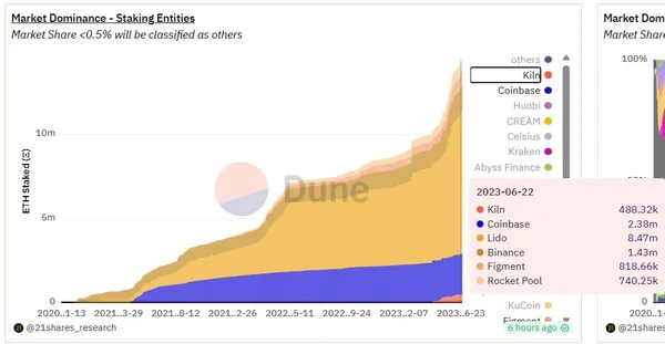 根據Dune圖表顯示,Coinbase目前仍維持排名第二大質押服務提供商的地位,但其他幾家快速成長的競爭對手Figment、RocketPool和Kiln等,也正在快速縮小差距中。