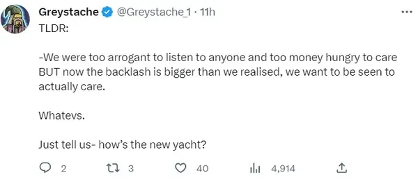 Tma420.eth 針對 Azuki 官方對於 Elementals 炎上事件的聲明,感到強烈不滿。他認為 Azuki 團隊當初為 Elementals 設置 2 ETH 以太幣的售價,就注定不會有新用戶進入這個社群,因為他們負擔不起,因此官方聲稱 Elementals 系列是為了「擴大社群」這個論點並不成立。